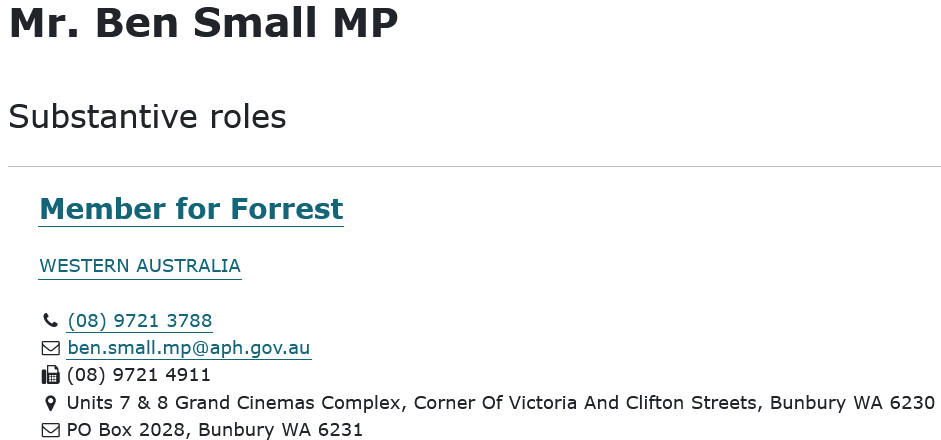- Contact our Federal MP about issues that matter to you. Writing a letter to our MP is a pro-active way to communicate your concerns directly. Each letter that is written must be responded to by him. Find a helpful how-to guide via this link. Mr Small's contact details: